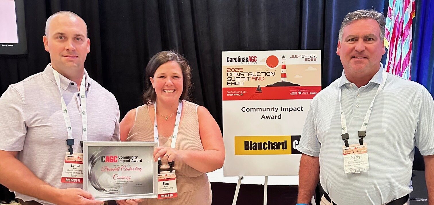Barnhill was honored to receive a 2025 Community Impact Award from the Carolinas Association of General Contractors. This award was for our Southeast Division’s volunteer work with Spring Lake Family Support Services – The Kinsey House. This incredible organization supports individuals and families in Cumberland County facing homelessness, domestic violence, and economic hardship. Our team was proud to contribute to their mission driven by compassion, community, and a shared commitment to making a different. We are proud to be part of the story!