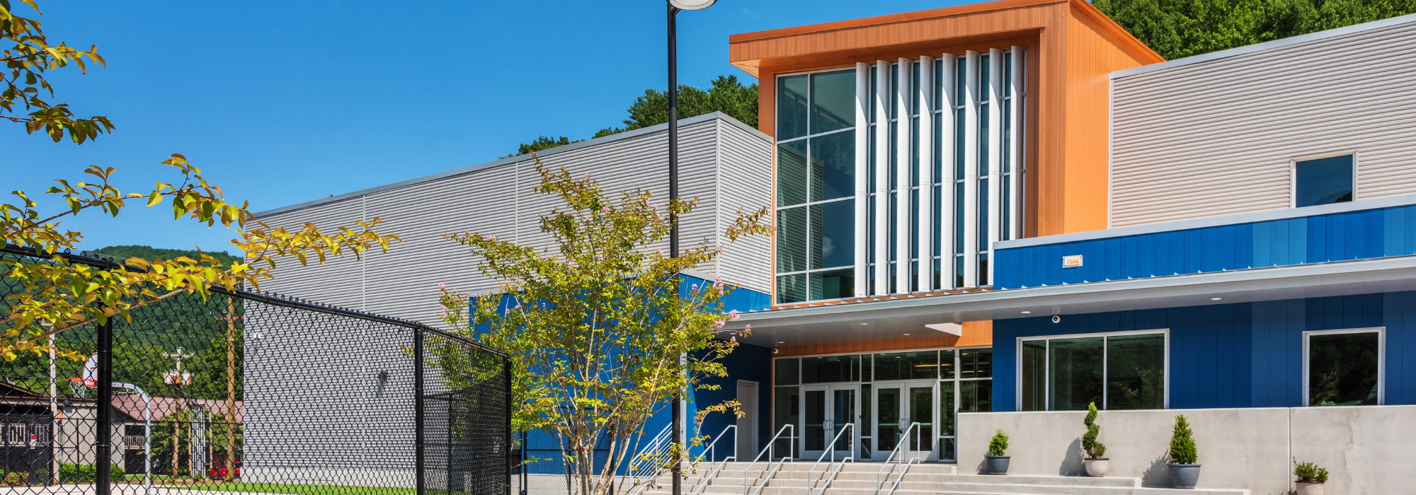 The Eastern Band of the Cherokee Indians Youth Center is a two-story, 53,800-square-foot steel frame building with administrative offices, classrooms, a library, a multipurpose room with a gym, a kitchen with an open cafeteria, a small amphitheater behind the building, and playground areas with padded artificial turf. This project also included an intensive site package consisting of earthwork, site utilities, storm drainage, landscaping, paving, and hardscape. The youth center was designed to be a safe and fun haven that excites children and offers services that benefit all ages, including high school students.